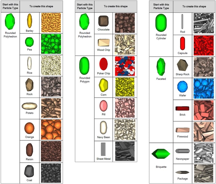 ROCKYでは、上図のような基本形状のコーナー数、アスペクト比などを変更することで、様々な形状を簡単に作成することが出来ます。基本形状以外にも、CADで作成した形状や、3D-Scanにより取得した任意の形状を使って粒子を作成することが可能です。これらは、球形粒子の結合体ではなく、完全なポリゴン形状です。